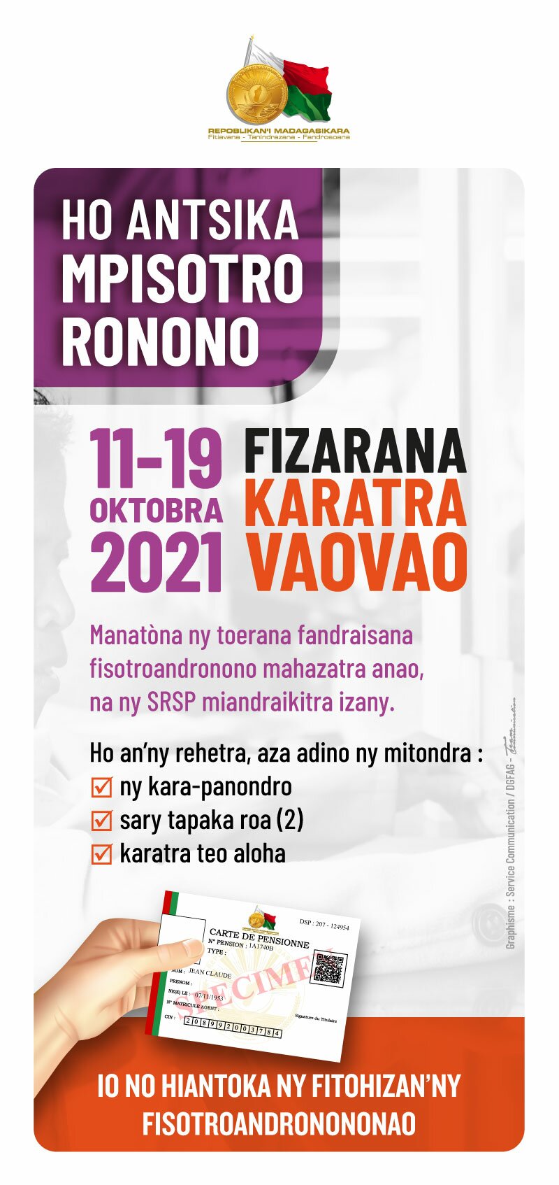 Mba hahamora ny fizarana ny karatra fisotroan-dronono vaovao dia mila miomana ireo mpiasam-panjakana misotro ronono manerana an’i Madagasikara fa manomboka ny 11 Oktobra ka hatramin’ny 19 Oktobra 2021 izao no fizarana ny karatra fisotroan-dronono vaovao. Manatona ny toerana fandraisana fisotroandronono efa mahazatra anao, na ny SRSP akaiky anao miandraikitra izany.