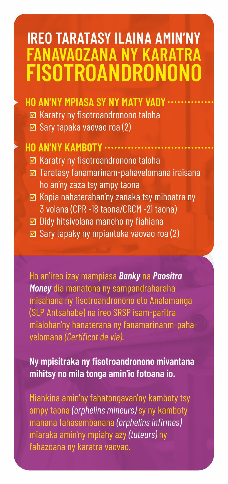 Ho an’ireo manana kaonty any amin’ny “Banky” na ny “Paositra Money” dia tokony hanatona ny Sampandraharaha misahana ny fisotroan-dronono eto Analamanga (SLP Antsahabe) na ireo SRSP isam-paritra mialoha ny hanaterana ny fanamarinam-pahavelomana.